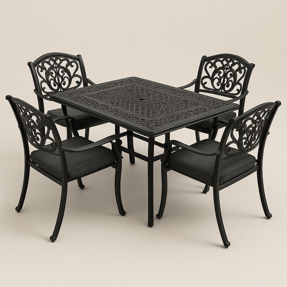 Kerti étkezőgarnitúra öntött alumíniumból párnázott székekkel
