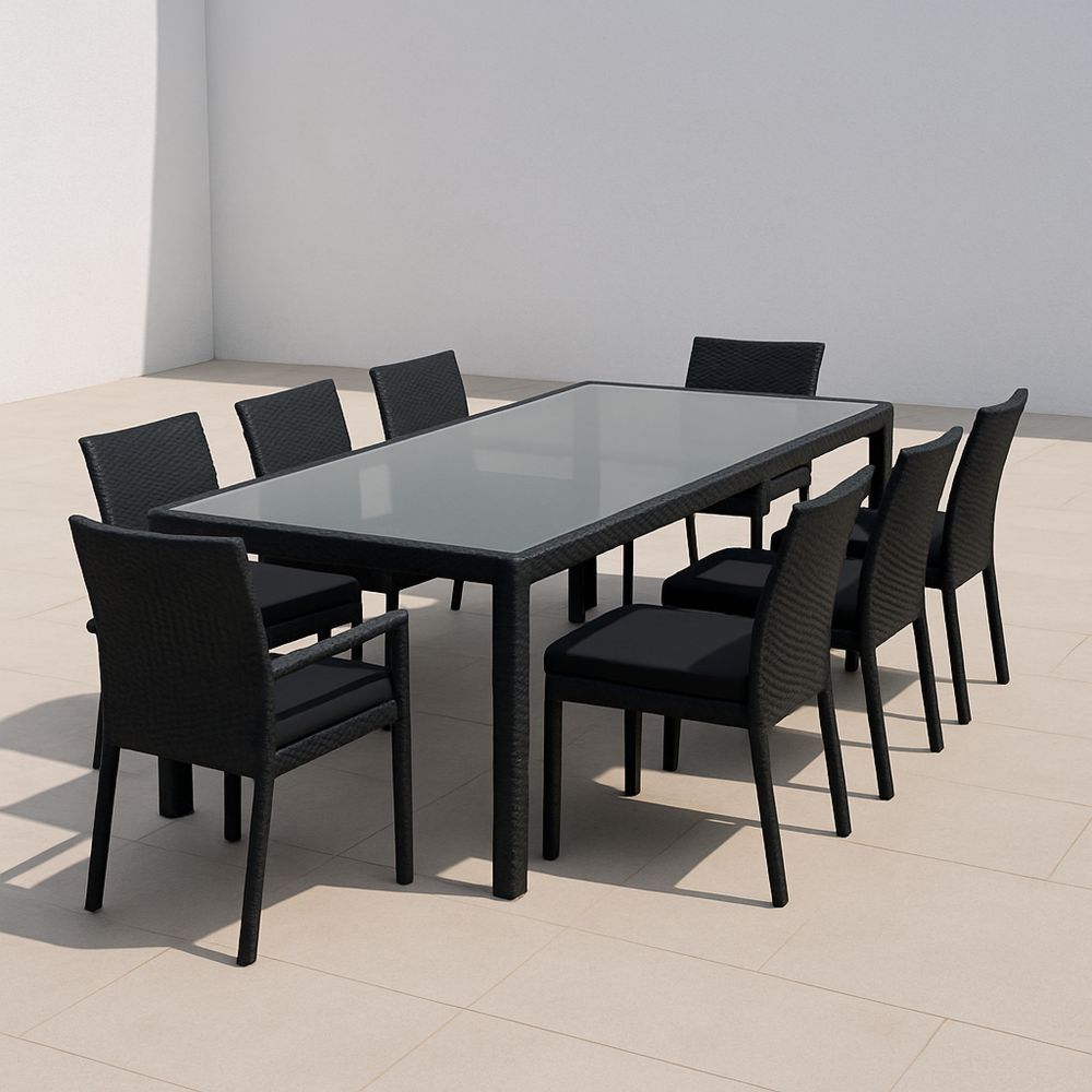 Kerti étkezőasztal szett 8 személyes edzett üveglap fonott fekete