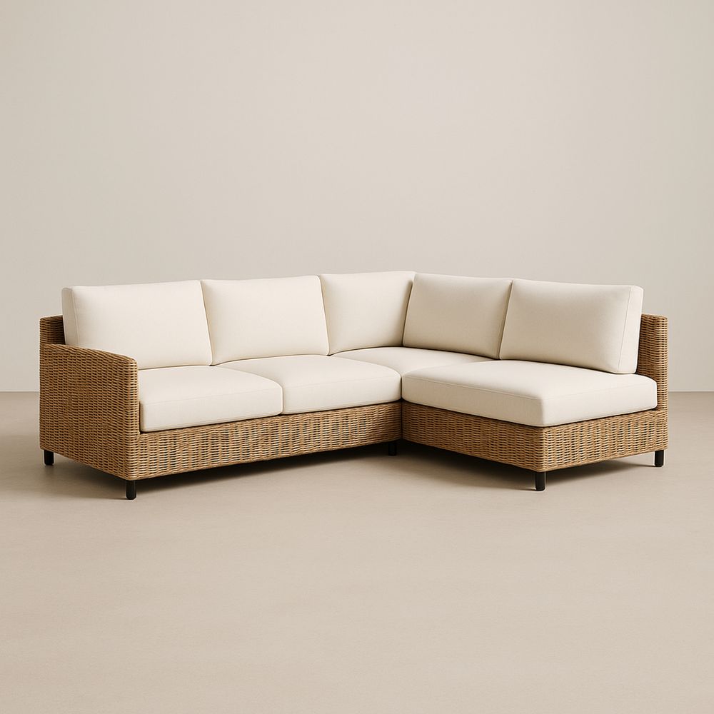 L-alakú PE rattan kanapé szett poliészter párnákkal, Ekrü